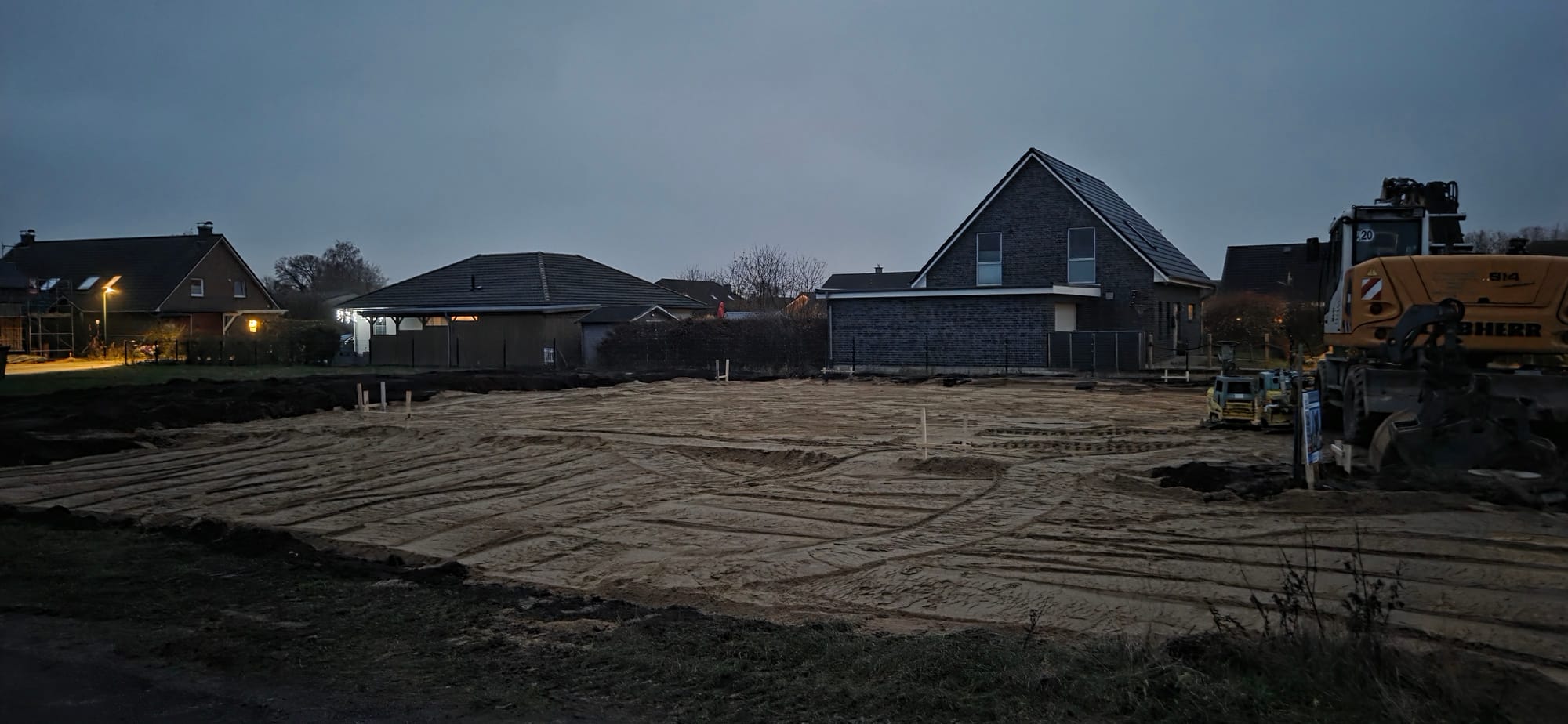 Bereits am Donnerstag rückten die Tiefbauer an und auf einmal war das Grundstück rund 20 cm angehoben und sah aus wie eine riesige Sandkiste. Ein großartiges Gefühl, dass nach über einem Jahr voller Papierkram endlich echte, sichtbare Arbeiten beginnen. Am Freitag konnten wir erneut erleben, wie viel an einem einzigen Tag passieren kann: Am Abend wirkte die Fläche schon deutlich größer.